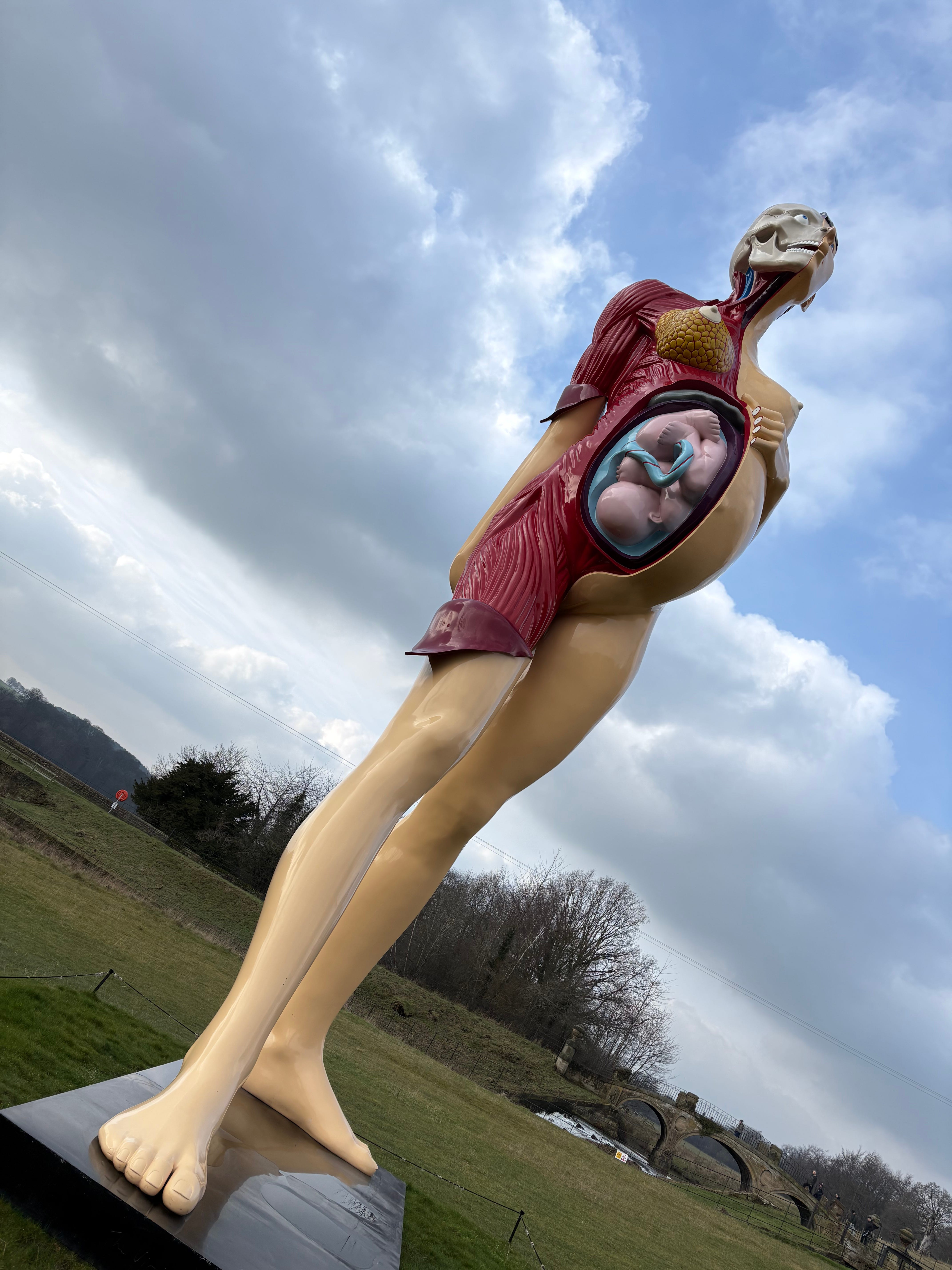 I glance back. Heron Island. There has been a herony at Bretton for several hundred years and the birds return annually to nest in the same place, the same trees, above the bulrushes and reeds. The Sculpture Park already seems otherworldly out of season, huge brightly coloured shapes rearing from the hillside, a massive sculpture that reads ‘LOVE’, the statued body of a pregnant woman by Damian Hirst, half her skull and muscles visible. We walk towards her, pulled. We stand beneath and look up at the marble bulge of her stomach, the impossible view of her carried child.