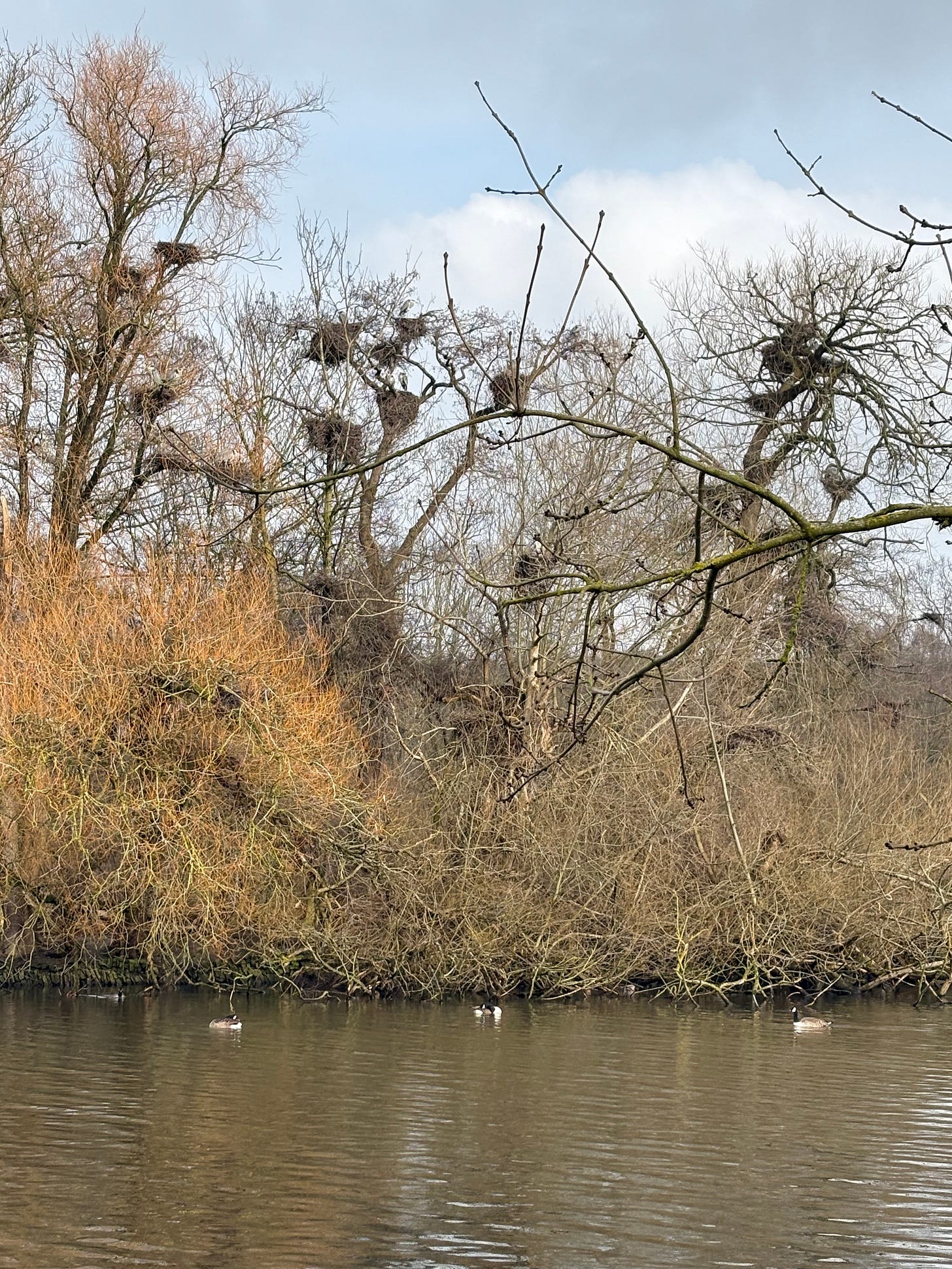 The sky is arrowed with cloud. Everything seems to point towards the tips and tops of the trees. From a distance, the island is all spindle, branches February bare. One tree is broken, stooping towards the water as if to drink. The others are upright, skinny, each of similar height. Once you get your eye in, you start to see nests in the upper quarters. And then something pale stirs just a fraction, and the herons appear one by one. A grey presence still and stately at the edge of the water. One furled in a nest. Another. A pair, facing the same direction, looking north, prows on a ship. A heron taking flight and skimming low across the lake, leaving Heron Island behind.